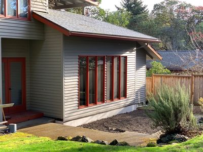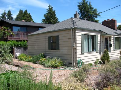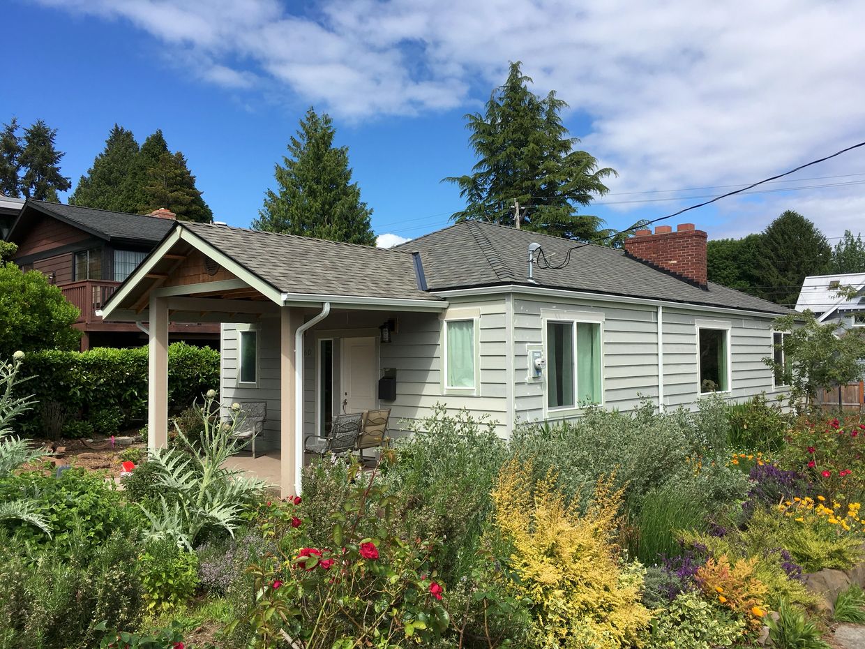The front door to this 1940s Seattle War House was in the middle of the long right side, as shown in this photo. But the location left a very short front yard of its long corner lot, and the feeling that the house was almost in the street. The project included some interior rework, to create new stairs to the existing basement, and some remodeling there. But the primary impact was the family suddenly had a more spacious front yard, facing a more quiet street. And now with an inviting place to sit, surrounded on three sides by the family's natural and lush, flower and veggie garden.