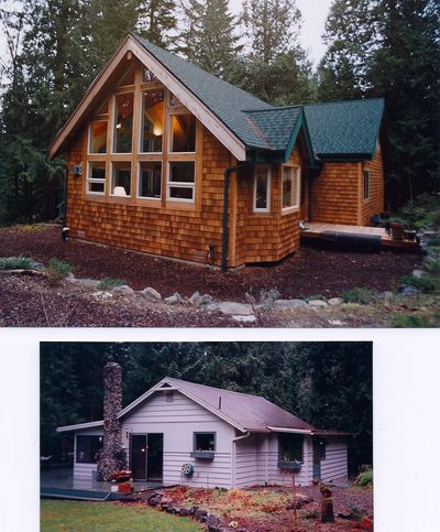 This major addition project began with the pre-war white painted riverside cabin shown. The photo facing side of that structure is now within the much larger rustic Cedar shingle home. The added space is mostly a huge great room with big beam vaulted ceiling, where the big window array provides a view down to the Cedar River. The rock fireplace was removed - its mortar was crumbling. And the wall of the old cabin was given a wide opening, so its kitchen could face the new great room. The new space is so inviting almost everything that happens in the house, happens there. A Nordic wood stove in the left corner easily keeps the classic Chalet space warm and toasty. And the new higher roof peak, when extended over the existing cabin, offered space for an added bedroom space. And as might be expected, the project more than doubled the daily enjoyment, and the value of the property.