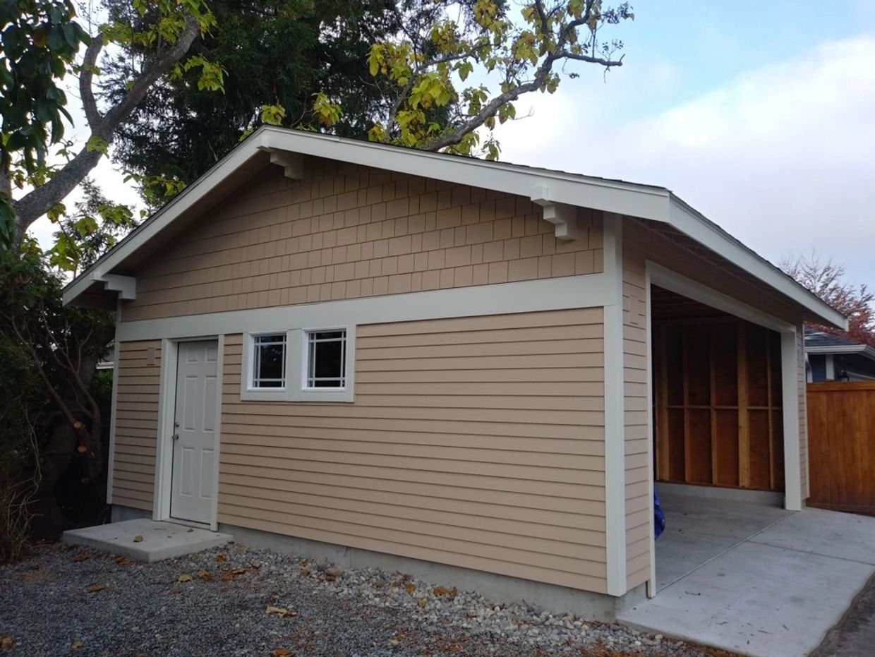 Another detached garage, its door not yet installed. This one to match an existing pre-war Craftsman Style home. Note the unusual head trim of the door and windows - it extends to and combines with the usual trim band, which reduces the amount of trim material for the project. And as typical to a trim band in the older home style era, the type of siding changes at the band. Cedar shingles above, horizontal siding below. And the nature of the knee braces is also different. These are stacked 4x4s that extend into the wall framing and are solidly connected there, to be structurally supportive to the gable end overhang and its fascia. All specified per the details of the existing home.